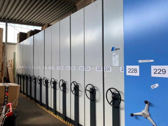 Gesamtaufstellfläche: ca. 10,10/3,06/2,33 m, inkl. Schienensystem, Fachböden, Verstrebungen und Einzelsteuerung, ohne Holzunterbau, bestehend aus: 14 Regalfeldern, doppelseitig, je ca. 3,06/0,6/2,33 m & ein Regalfeld, einseitig ca. 3,06/0,3/2,33 m, Fachbodenlänge je ca. 100 cm, 220/380 V, Inhalt nicht inbegriffen