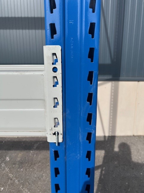 + 25 pz. telai preassemblati, nuovi, profondità 110 cm, altezza 5 m + 144 pz. travi, di seconda mano, lunghezza 3,7 m, 3800 kg di carico/scomparto + 288 pz. serrature di sospensione + 100 pz.